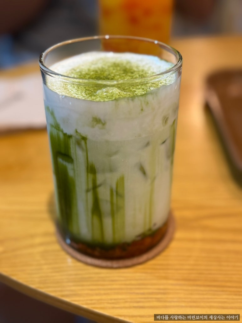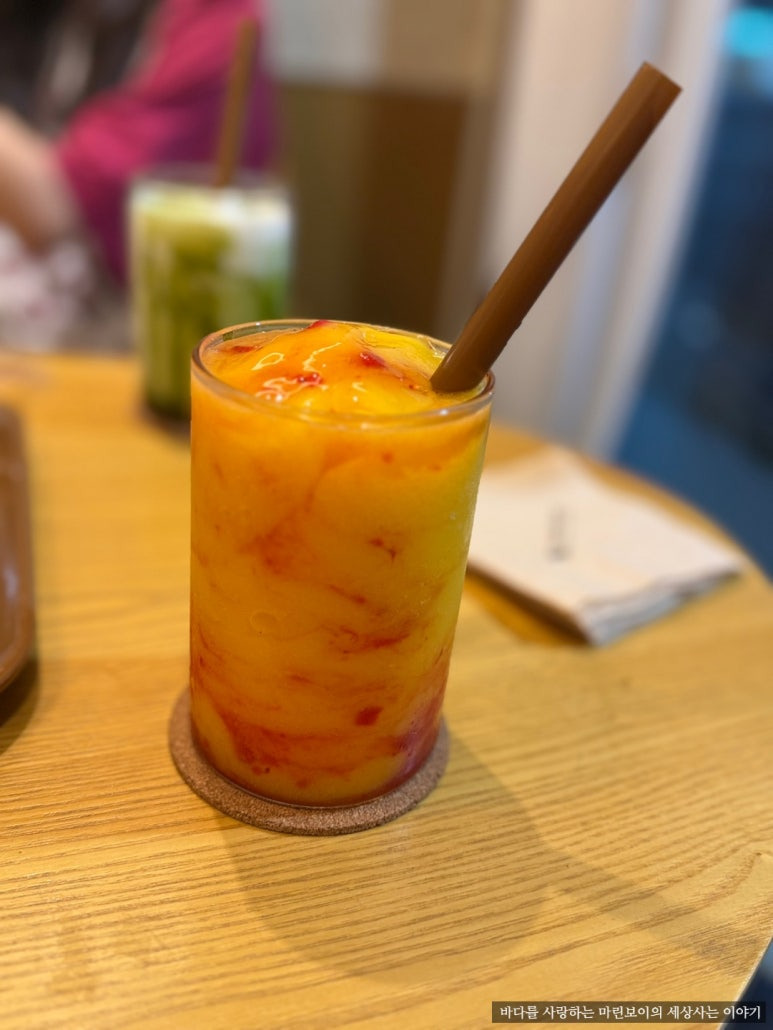 아이들이 주문한 '하동 첫 잎 말차 라테', 그리고 뒤쪽은 올 4월에 출시된 신 메뉴인 '망고 딸기 스무디'!