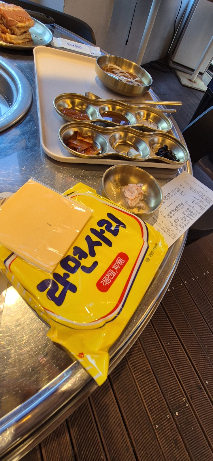 1인 트레이에 깔끔하게 담겨진 기본찬 이후에 불판이 등장했다.