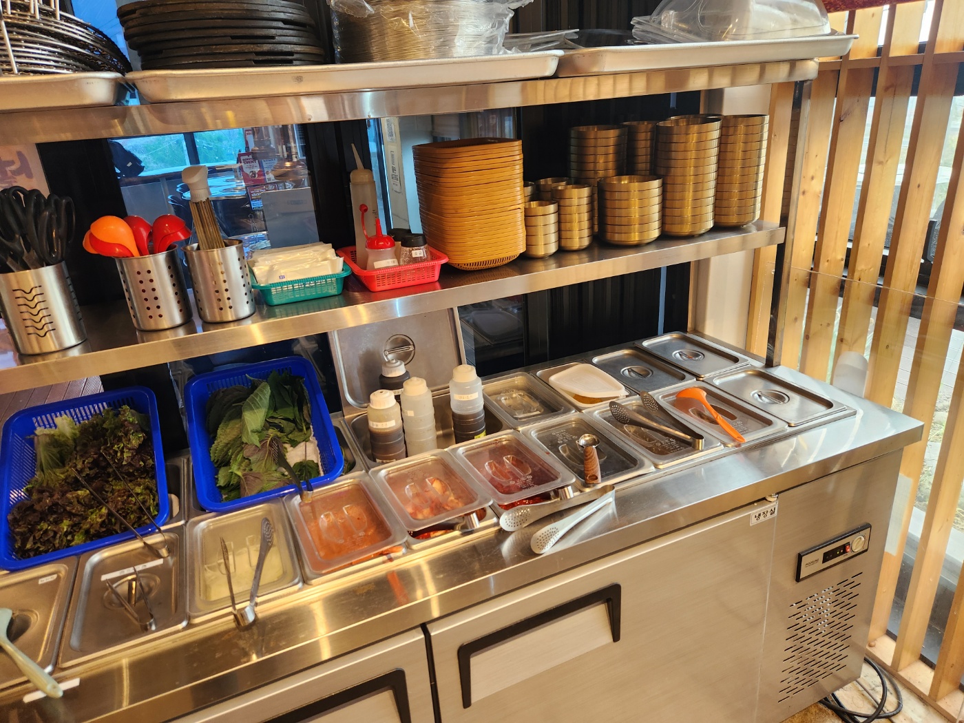 상추와, 깻잎, 다양한 소스와 반찬들이 깔끔하게 구성되어 있었다.