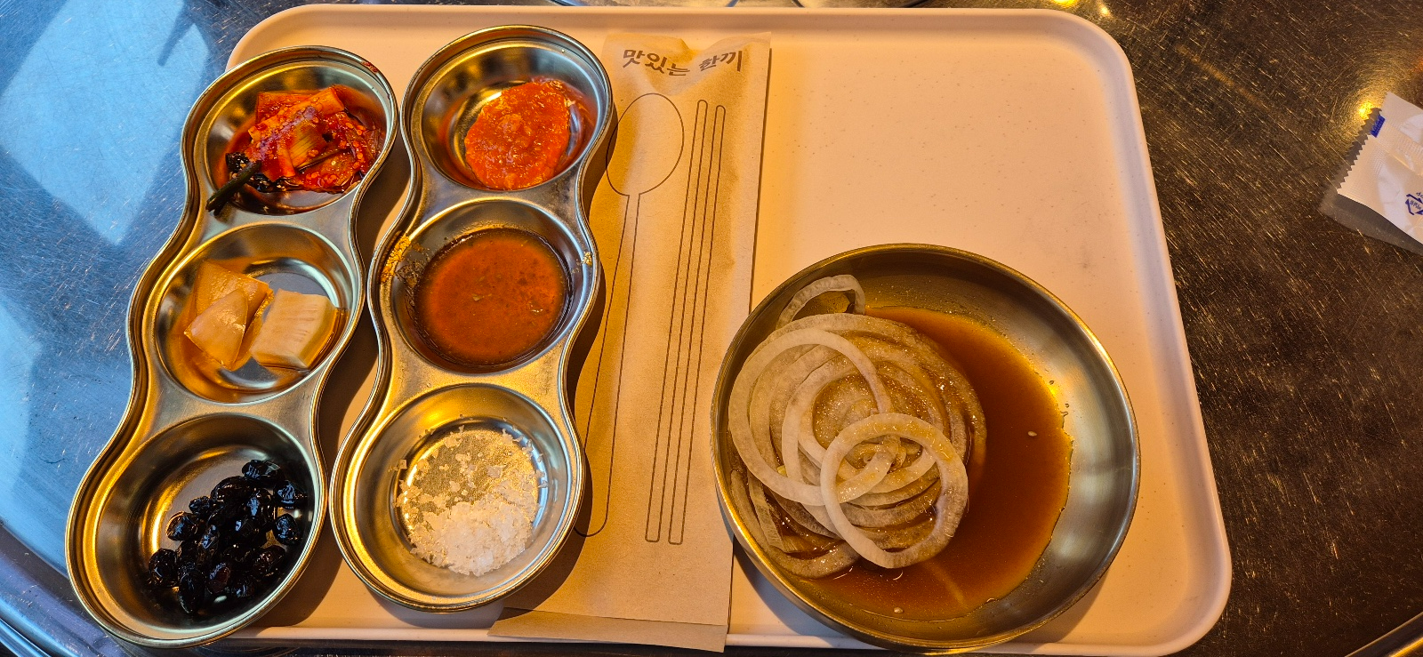 자리에 앉자마자 준비된 기본 상차림! 정말 깔끔하고 정갈하다. 개인 트레이에 적당량의 반찬이 담겨있었고 수저세트도 별도로 포장이 되어 있었다. 나는 개별적으로 저렇게 포장된 수저세트를 선호한다.
