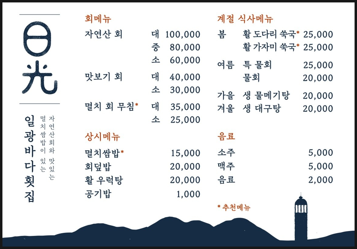 오늘 우리가 먹은 '자연산 회'와 '멸치 회 무침'이 너무나 맛있어서 다른 메뉴들의 맛도 궁금했다. 특히, 이곳의 대표 메뉴인 멸치쌈밥이 궁금하다. 멸치가 제철인 지금이 딱 제격인 메뉴인 듯하다.